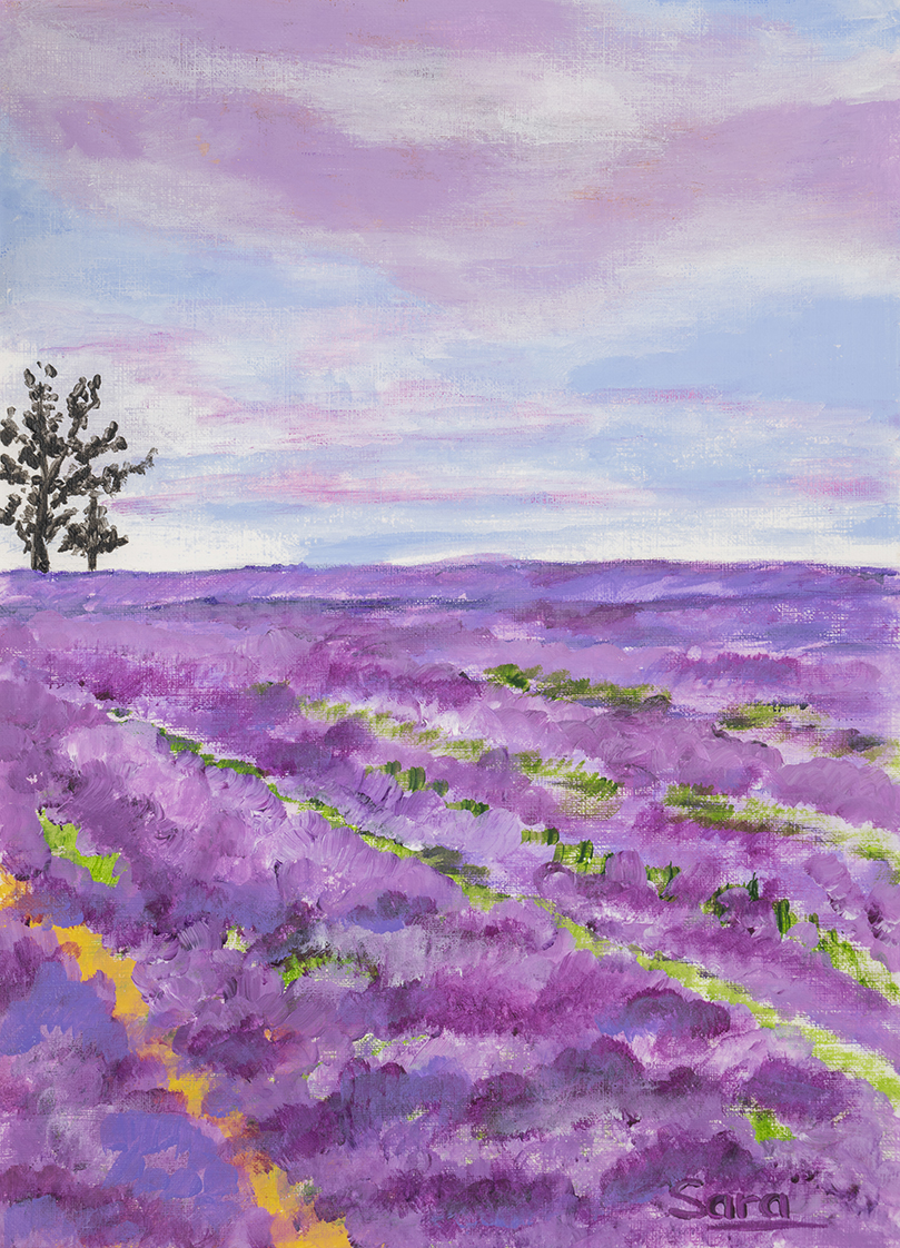 «Atardecer en un campo de lavanda en Brihuega», acrílico. Foto: Felipe Pérez Garre: https://felipeperezgarre.com/