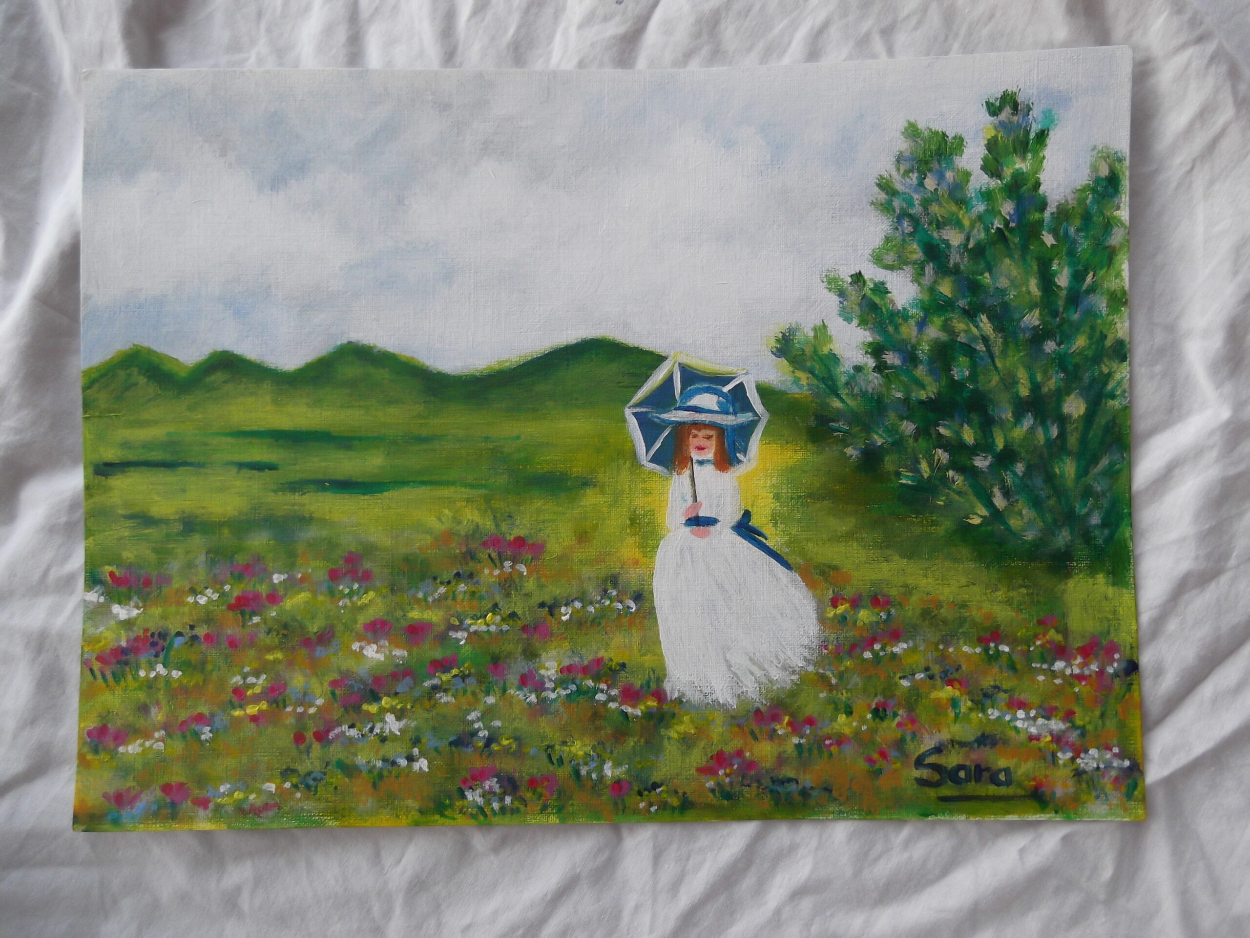 «Mujer con sombrilla», es una obra realizada en acrílico de la web de Sara Espinta. Una agradable escena campestre, en la que una mujer con un vestido blanco y sosteniendo una sombrilla, pasea por un campo lleno de flores. Hay más obras disponibles en la web de Sara Espinta que encajan con esta compra como «Casona» o «Casa rural». Una simpática propuesta con la que decorar cualquier estancia.