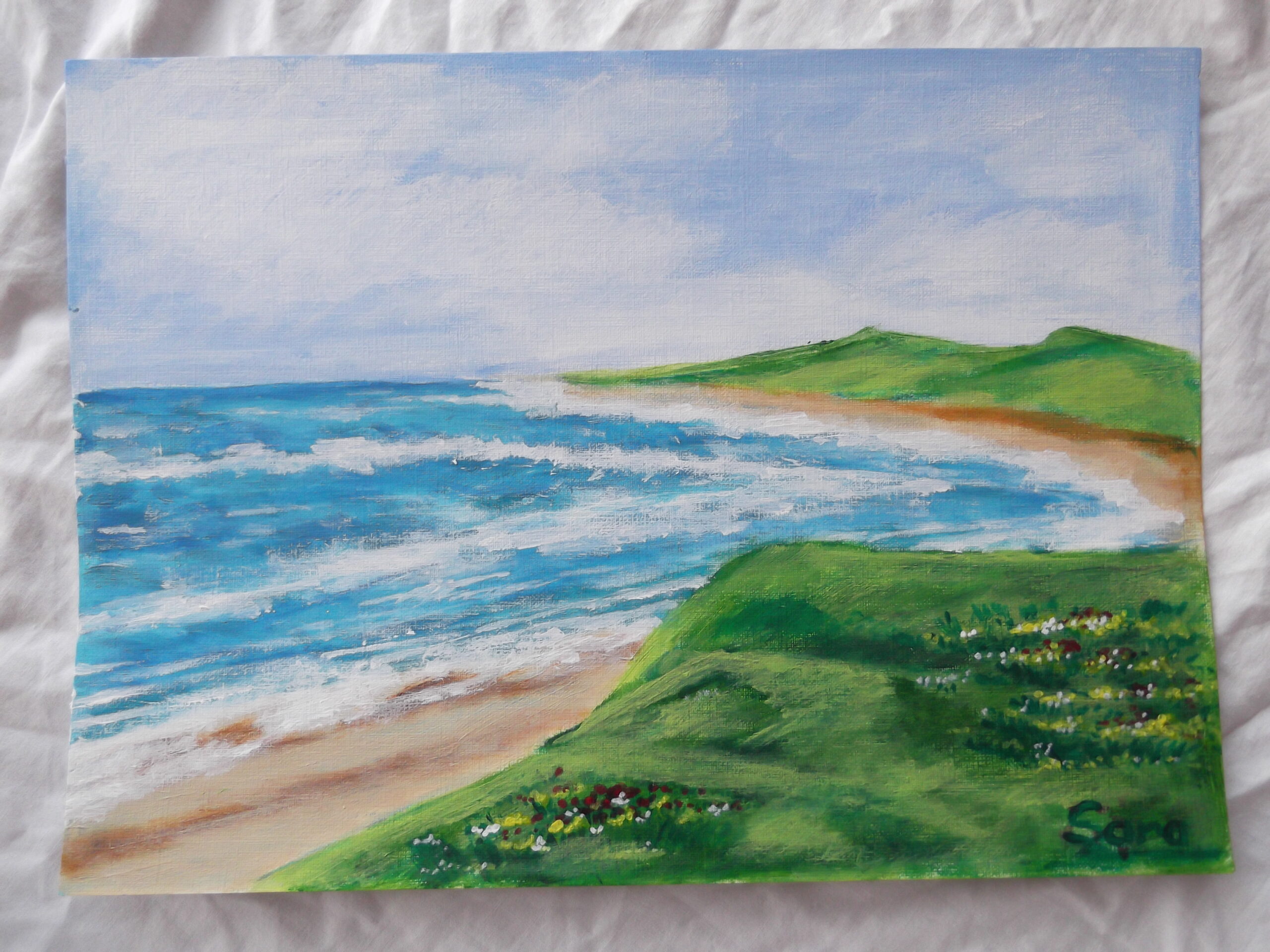 «Paisaje marino», es un acrílico de la web de Sara Espinta. Un típico paisaje del norte de España, en el que el monte y las verdes praderas enmarcan y adornan la vista del mar. Luz, sol y cielo despejado completan esta propuesta de una playa en un día de verano. Hay más obras disponibles en la web de Sara Espinta que se pueden añadir a esta compra como «Casona» o «Mujer con sombrilla» y que podrás comprar o regalar.