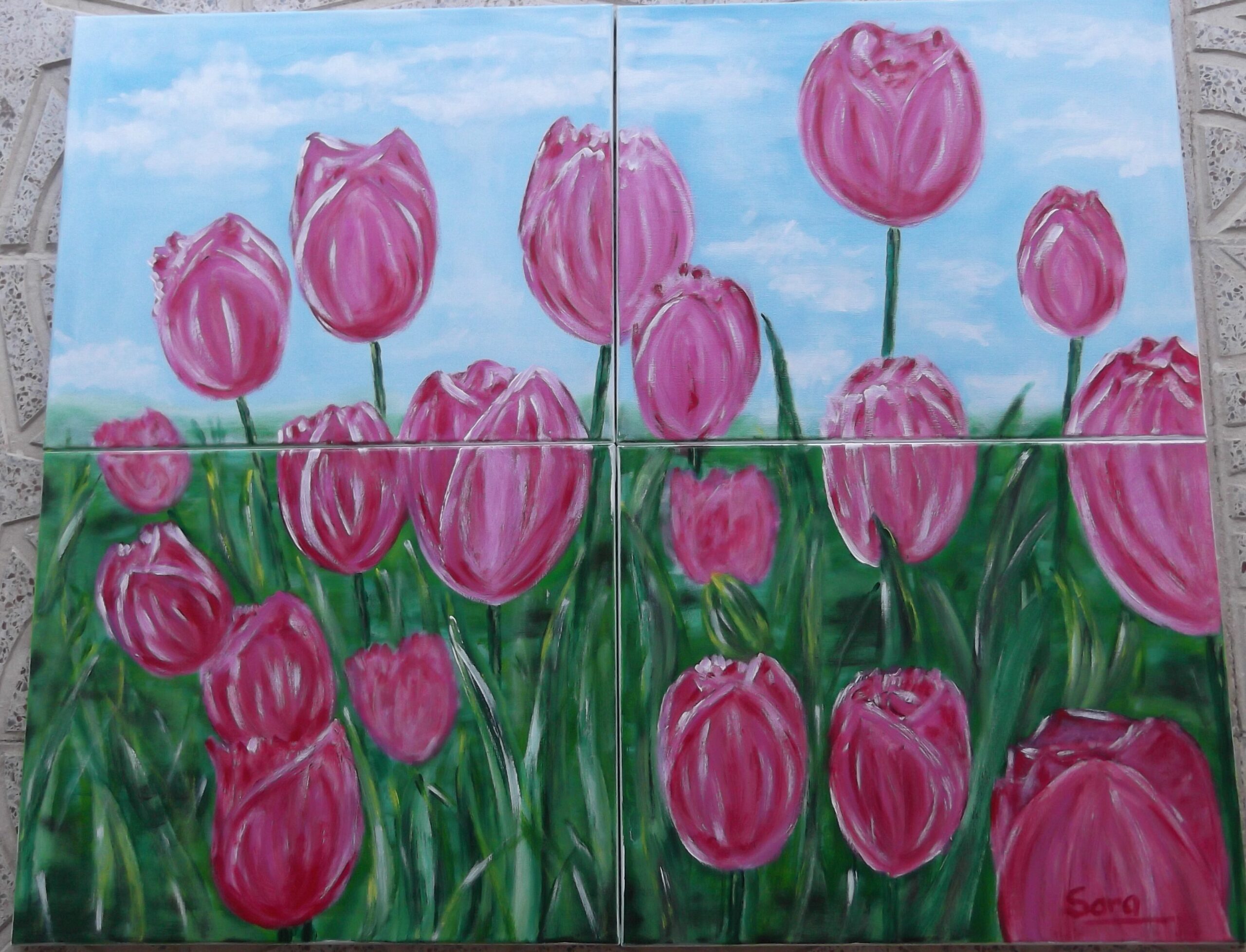 «Puzzle de tulipanes rosa», es una obra realizada en acrílico de la web de Sara Espinta. Un tema que se repite en la web en distintos formatos y técnicas como «Campo de tulipanes rosados» o «Trío de tulipanes rosa» y que se propone aquí como la suma de cuatro lienzos individuales que conforman el puzzle. Hay disponibles más obras en la web de Sara Espinta que completan esta elección como «Jarrón de lilas» o «Dalia de verano».