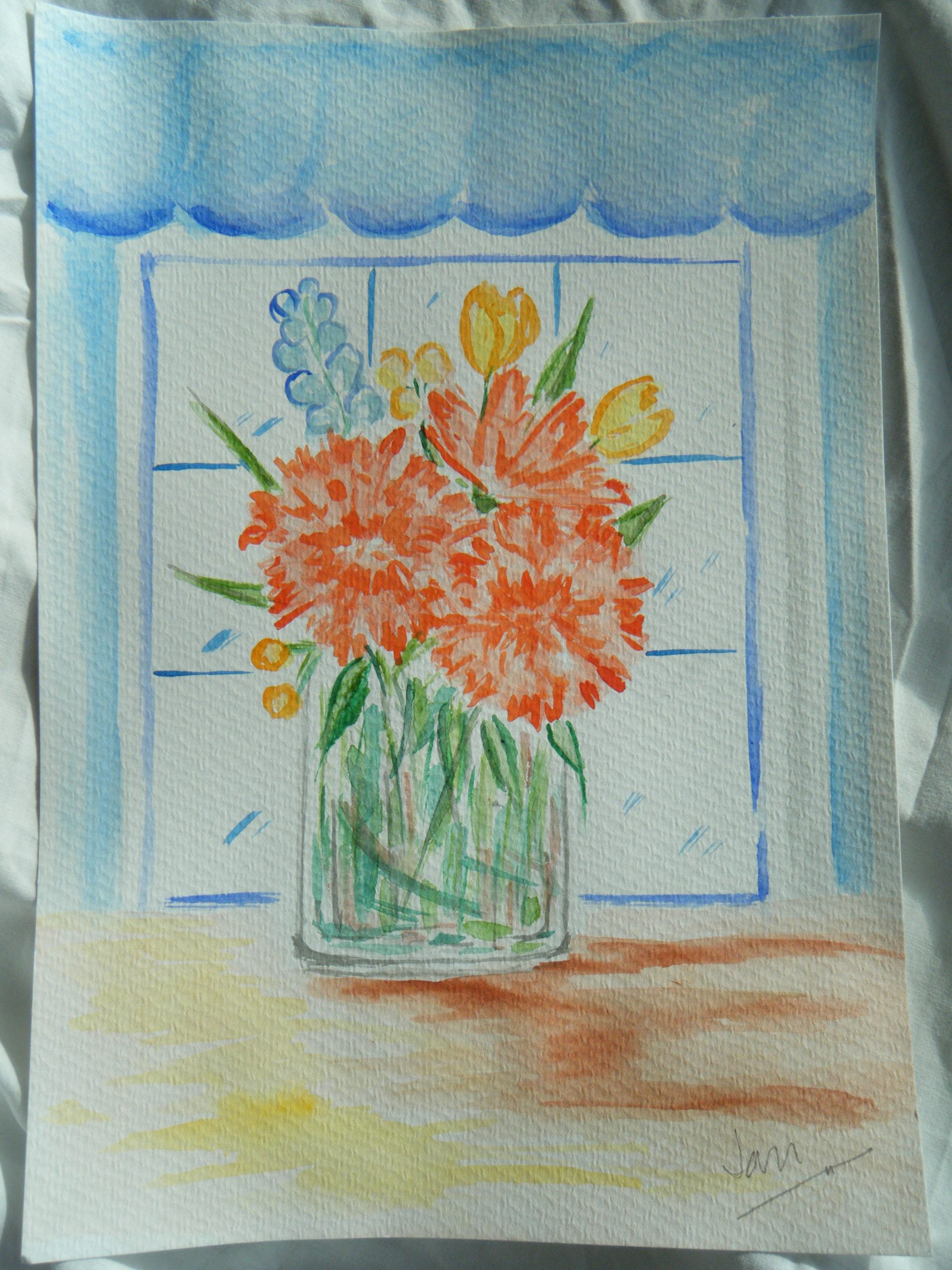 «Jarrón con claveles rojos y tulipanes amarillos», acuarela.